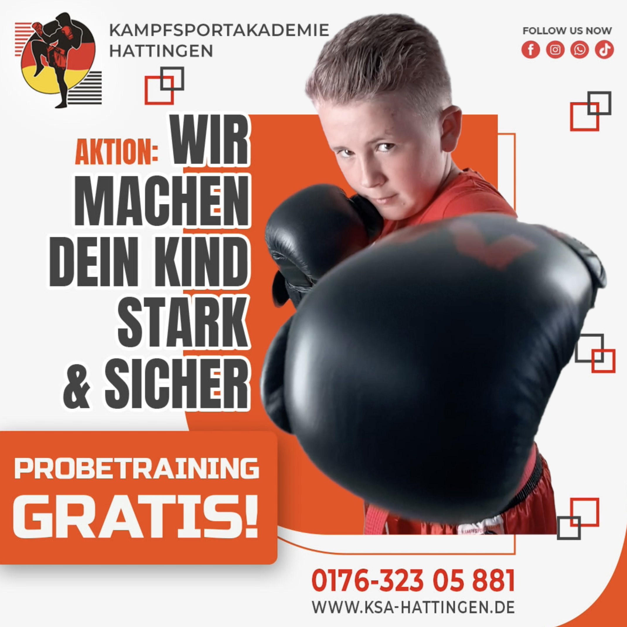 Melde Dein Kind zum Probetraining an! Überzeuge Dich selbst von den positiven Auswirkungen des Kampfsports. Besuche uns in der Kampfsportakademie Hattingen und lass Dein Kind an einem kostenlosen Probetraining teilnehmen. Unser erfahrenes Trainerteam freut sich darauf, Dein Kind in einer sicheren und motivierenden Umgebung zu begrüßen.