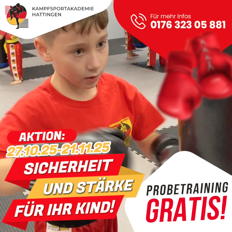 Melde Dein Kind zum Probetraining an! Überzeuge Dich selbst von den positiven Auswirkungen des Kampfsports. Besuche uns in der Kampfsportakademie Hattingen und lass Dein Kind an einem kostenlosen Probetraining teilnehmen. Unser erfahrenes Trainerteam freut sich darauf, Dein Kind in einer sicheren und motivierenden Umgebung zu begrüßen.